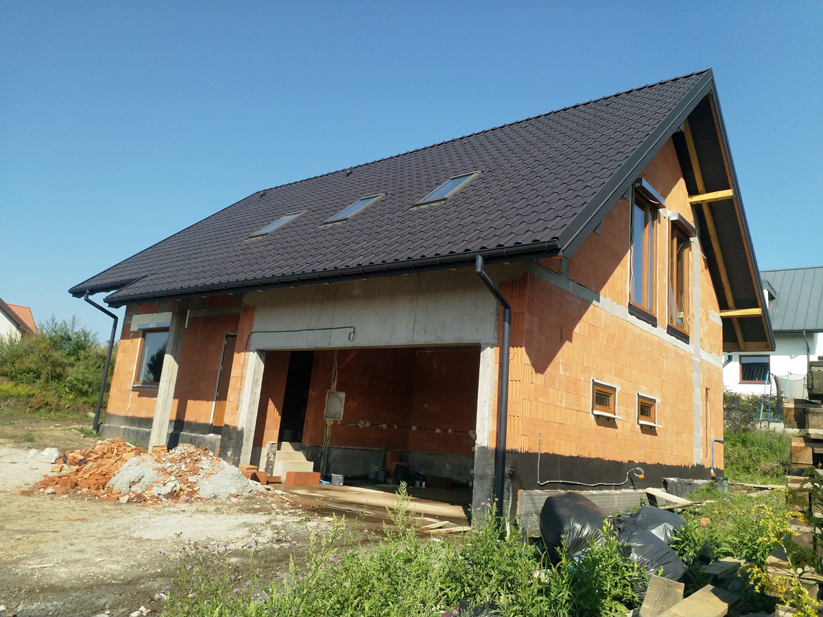 Budynek wykonany w stanie surowym otwartym z dachem oraz stan deweloperski w trakcie prac.